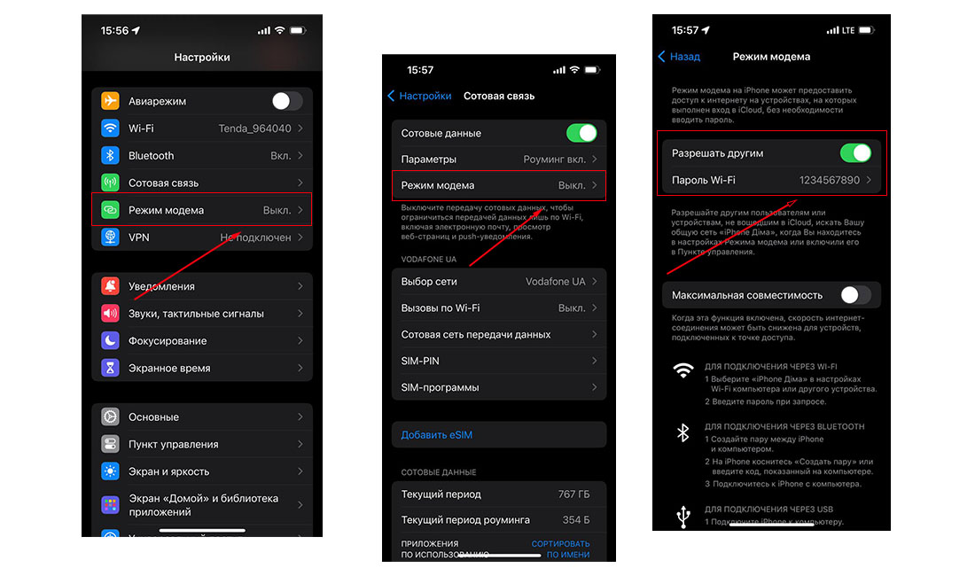 Відкрити «Налаштування» - «Режим модему» (попередньо перевірити, чи ввімкнено стільникові дані)
