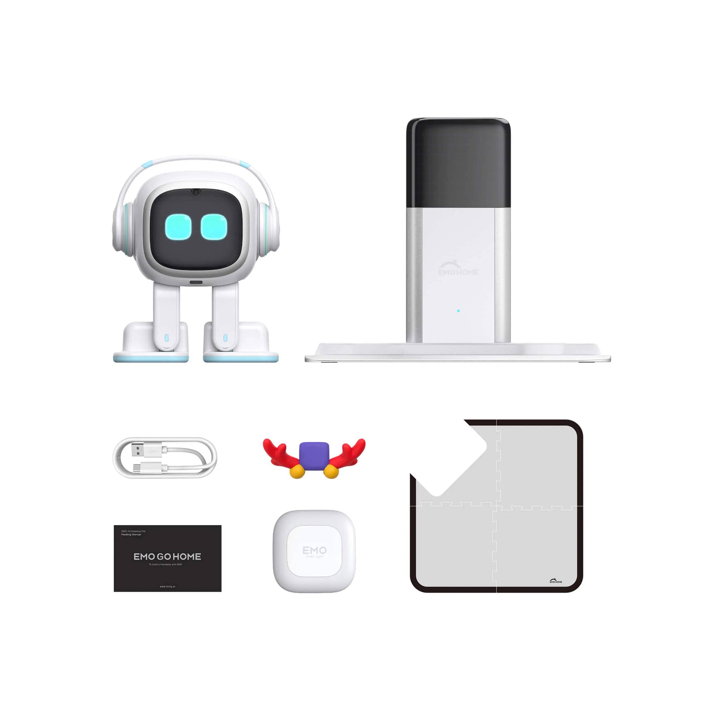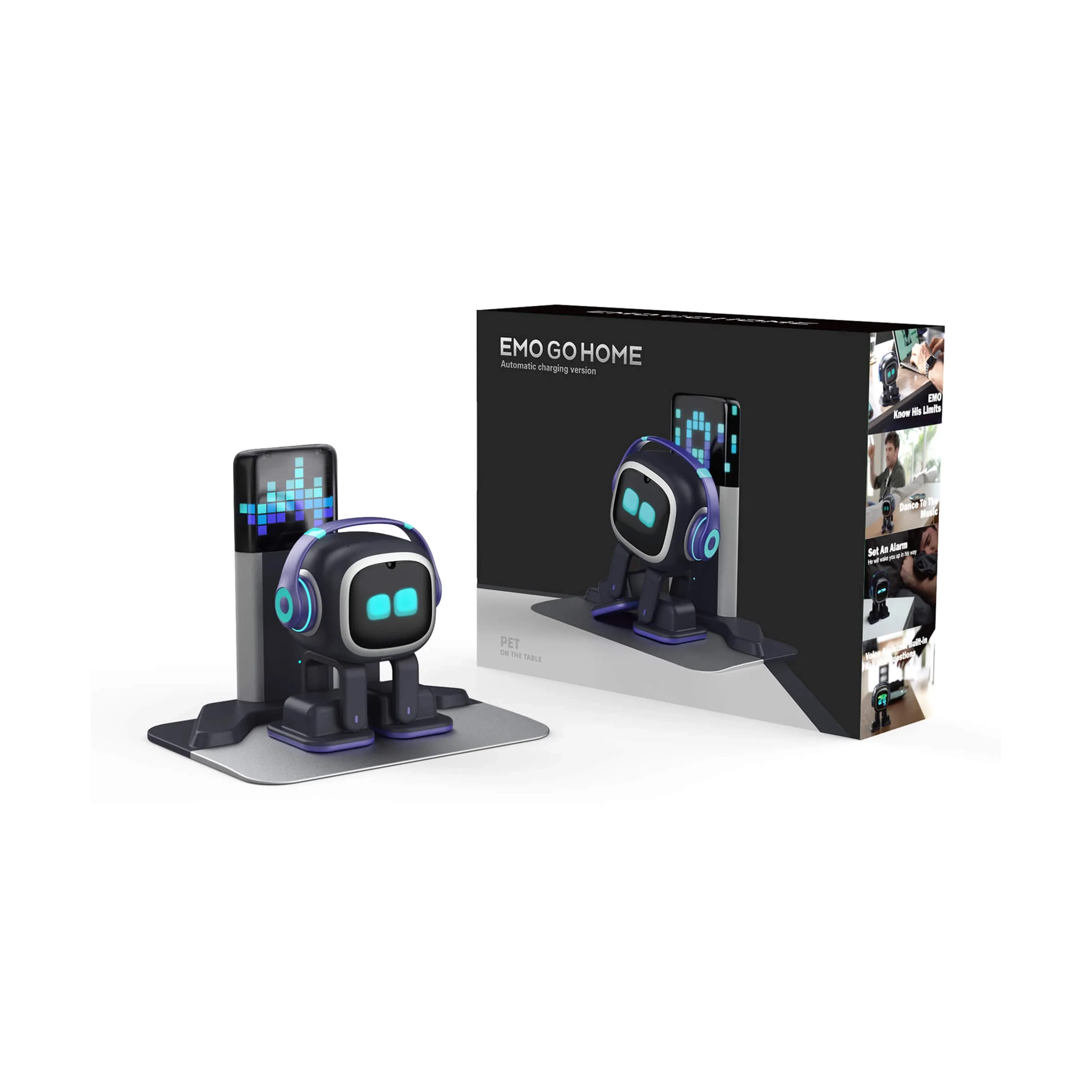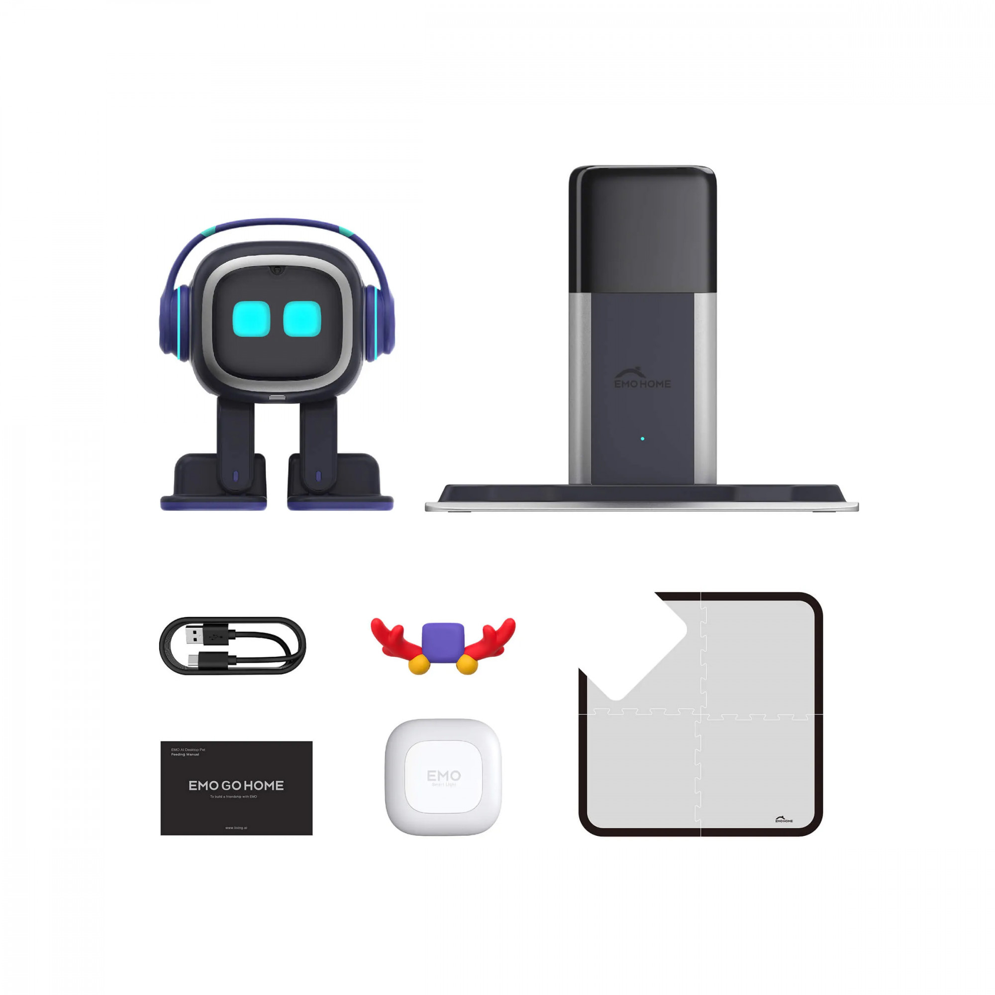 У комплекті постачається інтелектуальна база GO HOME — станція для автоматичного заряджання. Вона оснащена LED-дисплеєм і вбудованими сенсорами, які допомагають роботу орієнтуватися в просторі. Використовуючи лазерні датчики, гіроскоп, акселерометр і алгоритми навігації, EMO здатен самостійно знаходити зарядну станцію, коли рівень батареї низький. Домашній коврик, що входить у комплект, визначає зону безпечного пересування та дозволяє роботу комфортно орієнтуватися в межах столу чи іншої поверхні.